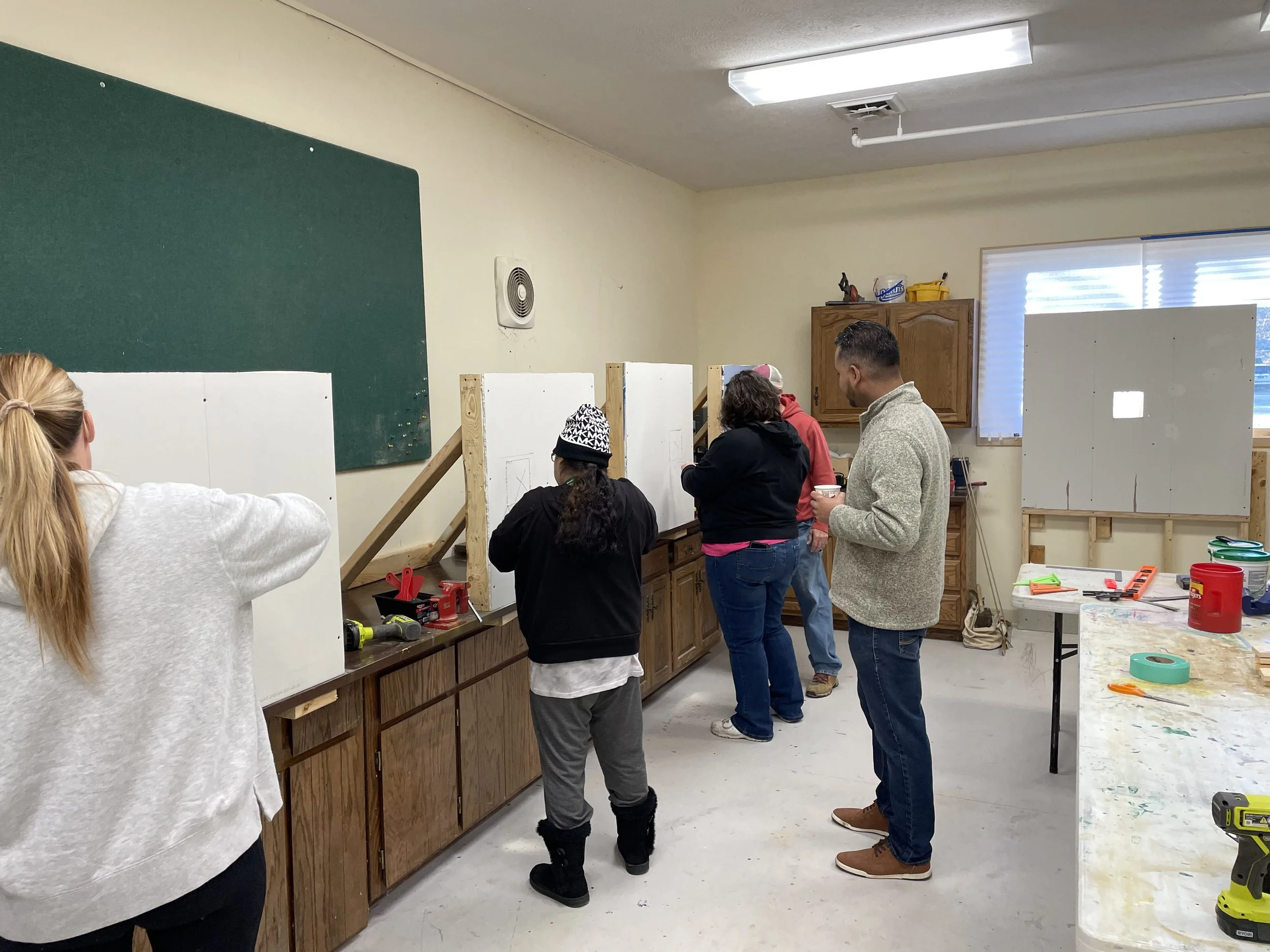 Each class will focus on safety, basic tools, techniques and hands-on DIY when applicable. Pictured are the sample board of the steps for drywall repair and some of our general work stations for this training.